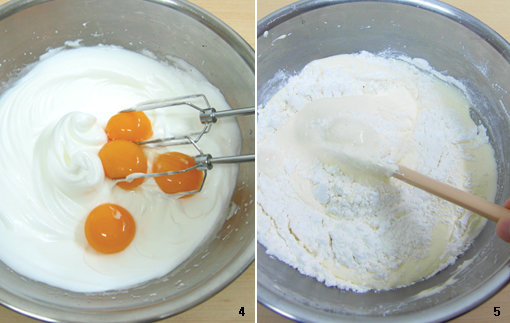 4 거품이 뻑뻑하고 단단해지면, 노른자를 넣고 약 1분간 충분히 섞는다.