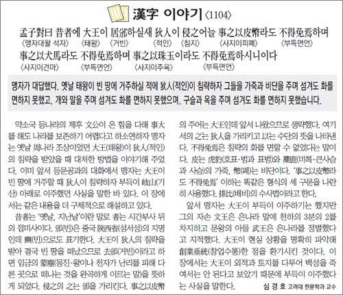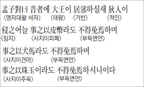 昔者는 ‘옛날, 지난날’이란 말로 者는 시간부사 뒤의 접미사이다. 빈은 중국 陝西省(섬서성)의 지명인데 빈으로도 표기한다. 大王이 狄人의 침략을 받아 결국 빈 땅을 떠났으므로 거빈이라고 하면 임금의 蒙塵(몽진·왕이나 천자가 난리를 피해 다른 곳으로 떠나는 것을 완곡하게 이르는 말)을 뜻하게 되었다. 侵之의 之는 빈을 가리킨다. 事之以皮幣의 주어는 大王인데 앞서 나왔으므로 생략했다. 여기서의 之는 狄人을 가리키고 以는 수단의 뜻을 나타낸다. 不得免焉은 침략의 화를 면할 수 없었다는 말이다. 皮는 虎豹(호표·범과 표범)와 미록(미록·큰사슴과 사슴)의 가죽, 幣(폐)는 비단이다. ‘事之以皮幣라도 不得免焉’ 이하는 똑같은 형식의 세 구문을 나란히 사용했다. 排比(배비)의 수사법이라고 한다.