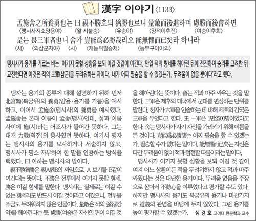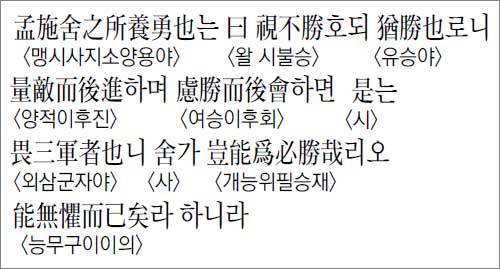 視不勝猶勝은 視A猶B의 짜임으로, A 보기를 B같이 여긴다는 뜻이다. 不勝은 전투에서 이기지 못할 형세, 勝은 이길 형세를 말한다. 맹시사는 실제로는 이길 수 없는 형세라도 반드시 이길 것이라고 여겼으니, 전투를 조금도 두려워하지 않은 인물이다. 量敵은 적의 强弱(강약)을 헤아린다는 뜻, 慮勝(여승)은 자신의 편이 이길 것을 헤아린다는 뜻이다. 會는 적과 마주 싸우는 것을 말한다. 三軍은 제후의 대국에서 군대를 편성하는 단위를 말한다. 천자가 六軍을 인솔하는 데 비해 제후의 강국은 三軍을 두었다고 한다. 또 一軍은 1만2500명이었다고 한다. 舍는 맹시사가 자기 자신을 가리키기 위해 이름을 든 것이다. 豈能爲必勝哉는 어찌 필승을 할 수 있겠는가, 필승할 수가 없다는 말이다. 能無懼而已矣는 자신은 다만 두려움이 없이 적과 접전할 따름이라는 말이다.