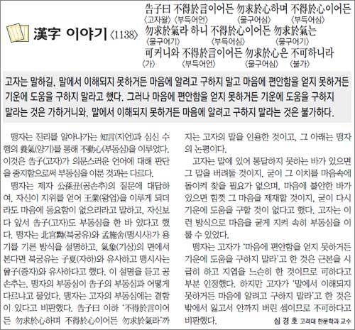 고자는 말에 있어 통달하지 못하는 바가 있으면 그 말을 버려둘 것이지, 굳이 그 이치를 마음속에 돌이켜 찾을 필요가 없으며, 마음에 불안한 바가 있으면 힘껏 그 마음을 제재할 것이지, 굳이 다시 기운에 도움을 구할 것이 없다고 했다. 고자는 이런 방식으로 마음을 굳게 지켜 속히 부동심을 이룰 수 있었다.