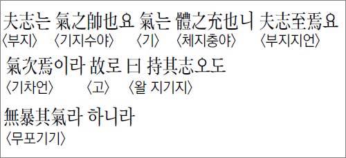 주자(주희)는 의지와 기를 內와 外, 本과 末의 관계로 파악해서 다음과 같이 풀이했다. 만일 그 지극한 경지를 논한다면 의지는 진실로 氣의 장수가 된다. 그러나 氣는 또한 사람의 몸에 꽉 들어차 있어서 의지의 卒徒(졸도)가 된다. 따라서 의지는 지극한 것이고 氣는 그 다음이 되므로, 사람은 마땅히 의지를 공경히 지켜야 하지만 기를 기르는 일도 극진히 하지 않으면 안 된다. 그래서 ‘의지를 잘 잡더라도 또 기를 거칠게 만들어서는 안 된다’고 매듭을 지었다.