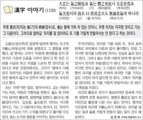 夫는 ‘무릇’이란 말로, 발어사이다. 志는 마음이 가는 바로, 마음의 지향성을 뜻한다. 氣는 몸 안에 가득 들어찬 활동력, 생명력을 말한다. 帥(수)는 將帥(장수)이다. ‘志至焉, 氣次焉’은 ‘의지는 지극한 것이고, 기는 그 다음이다’라는 뜻이다. 단, ‘의지가 이르러 가고서 기가 그 뒤를 따른다’고 풀이할 수도 있다. 故는 논거와 결론을 이어주는 접속사이다.