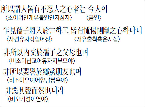 所以…者는 ‘…하는 이유는’이고, 아래의 두 所以…는 ‘…하려는 이유’이다. 현대 중국어의 所以는 ‘그래서’라는 뜻의 접속사로, 고전한문의 용법과는 다르다. 謂의 목적어는 ‘人皆有不忍人之心’이다. 今 이하는 가설적으로 사례를 든 것이다. 乍는 ‘갑자기, 문득’이다. 孺子將入於井은 어린아이가 막 우물에 빠지려는 상황을 말한 것이다. 출척은 두려워함, 惻隱은 불쌍해함이다. 內交는 교제를 맺음이다. 要譽는 인자하다는 명예를 구한다는 뜻으로, 要는 구할 求(구)와 같다. 鄕黨은 자신이 거주하는 곳을 가리킨다. 惡其聲은 잔인하다는 악명을 싫어한다는 말이다.