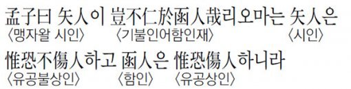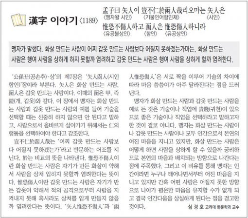 豈不仁於函人哉는 ‘어찌 갑옷 만드는 사람보다 어질지 못하겠는가’라고 반문하는 어조를 지닌다. 於는 비교의 뜻을 나타낸다. 惟恐不傷人이란 화살 만드는 사람은 자기가 만든 화살이 약해서 사람을 상처 입히지 못할까 염려한다는 뜻이다. 惟恐傷人이란 갑옷 만드는 사람은 자기가 만든 갑옷이 약해서 적의 공격으로부터 사람을 지켜내지 못해 혹시라도 상처를 입게 만들지 않을까 염려한다는 뜻이다. ‘矢人惟恐不傷人’과 ‘函人惟恐傷人’은 서로 짝을 이루어 기술의 차이에 따라 마음 씀씀이가 아주 달라진다는 점을 드러낸다.