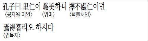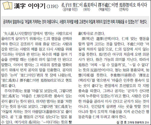 擇(택)은 選擇(선택)이다. 仁에 맞는 행동을 할까 말까 고르는 것을 말한다. 不處仁이란 ‘어짊에 처하지 않음’으로, 仁의 입장에 서지 않는 것을 뜻한다. 焉(언)은 어구의 처음에 오면 의문사가 된다. 得은 가능의 의미를 지닌다. 따라서 焉得은 ‘어찌 ∼일 수 있을까’로, ‘∼일 수 없다’는 뜻의 反語(반어)이다. 智는 知와 통용되며, 知慧(지혜)를 뜻한다. 李重煥(이중환)은 ‘擇里志(택리지)’를 엮으면서 ‘마을은 인후한 풍속이 있는 곳이 좋다’는 관점에서 조선팔도의 각 지방 풍속을 따졌다. 그러나 공자는 ‘군자가 산다면 어찌 누추함이 있겠는가’라고 했다. 사람은 인후한 마을을 골라서 이사 간다고 군자가 되는 것이 아니다. 인간답게 살려면 사는 곳을 탓할 것이 아니라 항시 도덕적 자율성을 지켜 순간순간 행동준칙을 仁에 두려고 해야 한다.