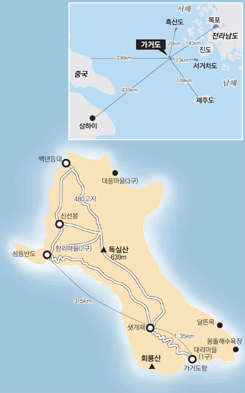 ‘가거도에선 중국의 닭울음소리가 들린다’고 한다. 중국과 가장 가까운 섬이라는 뜻일 게다. 실제 직선거리는 가거도∼상하이 435㎞(중국대륙 최단거리 336㎞), 가거도∼목포 145㎞, 가거도∼제주 148㎞, 가거도∼흑산도 70㎞이다. 제주 북서쪽, 목포 서남쪽, 흑산도 남서쪽에 가거도가 웅크리고 있는 것이다.
