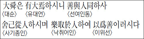 舜 임금은 아버지가 자신을 용납하지 않는데도 진심으로 효를 다해서, 大孝(대효) 혹은 出天之孝(출천지효·하늘이 낸 효자)의 성인으로 손꼽힌다. 또 堯(요) 임금으로부터 帝位(제위)를 물려받고 자신도 禹에게 제위를 물려주었으므로, 禪讓(선양·제위를 어진 사람에게 물려줌)을 행한 성군으로 칭송된다. 다스리던 곳의 이름을 따서 有虞氏(유우씨)라고도 한다. 有大焉은 ‘이것보다 큼이 있다’로, 焉은 종결사이되 지시 기능을 지닌다. 善與人同은 與人同善에서의 善을 앞으로 빼어 강조했다고 할 수 있다. 자기의 선이냐 남의 선이냐를 따지지 않고 선을 보면 남과 함께 실행했다는 뜻이다. 舍己從人은 ‘나를 버리고 남을 좇다’이니, 舍는 버릴 捨(사)의 옛 글자이다. ‘樂取於人하여 以爲善이러시다’에서 樂(낙)의 빈어(목적어)는 ‘取於人以爲善’이다. 따라서 이 구절은 ‘남에게서 취해 선을 행함을 즐겨 했다’고 풀이된다.