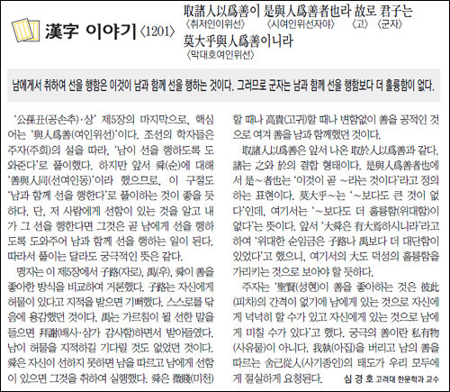 주자는 ‘聖賢(성현)이 善을 좋아하는 것은 彼此(피차)의 간격이 없기에 남에게 있는 것으로 자신에게 넉넉히 할 수가 있고 자신에게 있는 것으로 남에게 미칠 수가 있다’고 했다. 궁극의 善이란 私有物(사유물)이 아니다. 我執(아집)을 버리고 남의 善을 따르는 舍己從人(사기종인)의 태도가 우리 모두에게 절실하게 요청된다.
