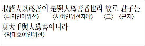 取諸人以爲善은 앞서 나온 取於人以爲善과 같다. 諸는 之와 於의 결합 형태이다. 是與人爲善者也에서 是∼者也는 ‘이것이 곧 ∼라는 것이다’라고 정의하는 표현이다. 莫大乎∼는 ‘∼보다도 큰 것이 없다’인데, 여기서는 ‘∼보다도 더 훌륭함(위대함)이 없다’는 뜻이다. 앞서 ‘大舜은 有大焉하시니라’라고 하여 ‘위대한 순임금은 子路나 禹보다 더 대단함이 있었다’고 했으니, 여기서의 大도 덕성의 훌륭함을 가리키는 것으로 보아야 할 듯하다.