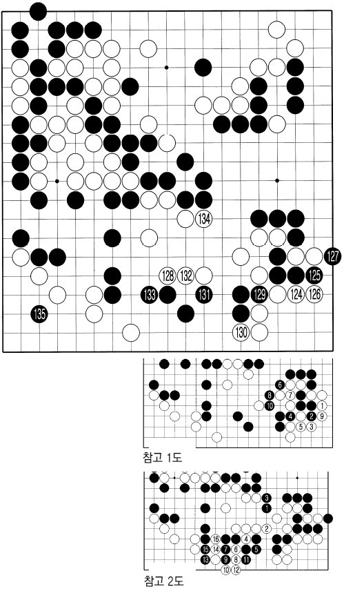 백 124를 두는 이세돌 9단의 마음은 아프다. 돌을 여러 개 투입했는데 살려줘야 하다니…. 하지만 어쩔 수 없다. 참고 1도처럼 백 1, 3으로 두면 흑은 잡을 수는 있지만 흑 10까지 중앙이 전부 흑집으로 변한다. 이렇게 되면 확실한 흑의 승리.