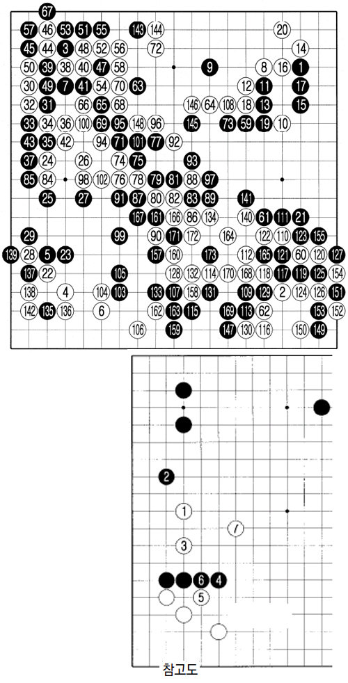 결과론적이지만 백 24는 참고도처럼 백 1, 3으로 흑을 공격하면서 백 7까지 두는 게 알기 쉬웠다. 때로는 수를 내는 화려함보다 평범한 길이 나을 때가 많다.
