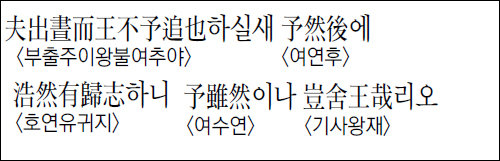 夫는 발어사이다. 王不予追也는 王不追予也에서 동사와 목적어를 도치한 표현이다. 짧은 부정문에서 목적어가 대명사일 때 동사와 목적어를 도치하되 그 목적어를 부정사와 동사 사이에 둔 것이다. 浩然은 물이 흘러 멈추지 않듯이 뒤돌아보지 않고 떠나가는 모습을 나타낸다. 雖然은 ‘그렇기는 하지만’의 뜻으로, 予보다 앞에 둘 수도 있다. 舍는 버릴 捨(사)와 같다.