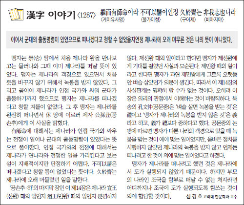 맹자가 제나라를 떠나려고 했던 것은 제나라에서 도가 실행되지 않았기 때문이다. 하지만 부모의 나라인 조국을 함부로 떠날 수 없는 처지라면 어디까지나 조국에 도가 실행되도록 힘쓰는 것이 의에 합당할 것이다.
