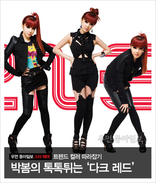 레드 헤어의 아이콘으로 불리고 있는 2NE1의 박봄이 선택한 컬러는 다크 레드다. 그녀의 여성스러운 매력을 살리는 동시에 컬러를 더욱 돋보이게 하는 컬이 굵은 웨이브나 스트레이트로 연출하는 것이 포인트다.