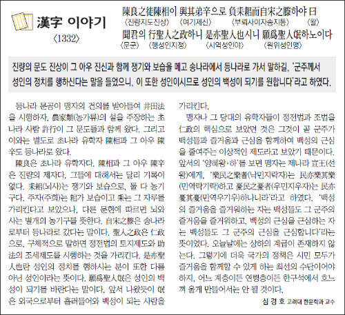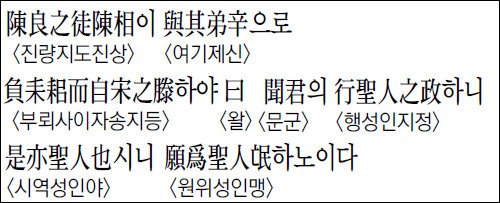 陳良은 초나라 유학자다. 陳相과 그 아우 陳辛은 진량의 제자다. 그들에 대해서는 달리 기록이 없다. (뇌,뢰)사(뇌사)는 쟁기와 보습으로, 둘 다 농기구다. 주자(주희)는 사가 보습이고 (뇌,뢰)는 그 자루를 가리킨다고 보았으나, 다른 문헌에 따르면 뇌와 사는 별개의 농기구를 뜻한다. 自宋之등은 송나라로부터 등나라로 갔다는 말이다. 聖人之政은 仁政으로, 구체적으로 말하면 정전법의 토지제도와 助法의 조세제도를 시행하는 것을 가리킨다. 是亦聖人也란 성인의 정치를 행하시는 분이 또한 다름 아닌 성인이라는 뜻이다. 願爲聖人氓은 성인의 백성이 되기를 바란다는 말이다. 앞서 나왔듯이 氓은 외국으로부터 흘러들어와 백성이 되는 사람을 가리킨다.