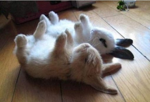 사진 속에는 두 마리 토끼가 나란히 누워 다리를 하늘을 향해 곧게 뻗고 있는 모습이 특징이다.