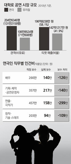 서울연극센터가 8일 공개한 ‘대학로 연극 실태조사 보고서’에 나타난 대학로 연극인의 모습이다. 조사는 2010년 1년간 대학로에 공연된 연극과 뮤지컬 총 528편(연극 431편, 뮤지컬 97편)을 대상으로 했으며 관객 1000명, 공연 종사자 300명을 설문 조사했다.