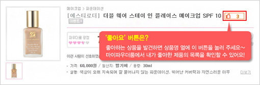 여타 사이트에서는 볼 수 없는 신개념 best 10 차트도 마련했다. 이번 개편을 통해 개설된 ‘인기 키워드 best 10’은 화장품의 다양한 키워드에 따라 제품의 best 10 차트를 꼼꼼히 검색할 수 있다. 1. ‘좋아요’ 기능 앳 파우더룸에서 상품 정보나 리뷰를 열람하다가, 자신이 관심이 있고 좋아하는 제품에 투표와 스크랩을 할 수 있는 기능. ‘좋아요’의 투표 기능은 이번 개편에 확장된 ‘파우더룸 best 10’에도 반영되어 최근 회원들의 관심을 받고 있는 화장품이 어떤 것인지 한눈에 파악할 수 있다.