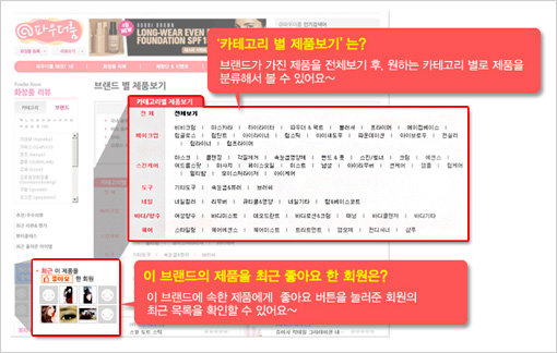 세부적으로는 ‘좋아요’ 기능이 추가되어 내가 원하는 제품을 스크랩하고, 타인이 좋아하는 제품을 한눈에 볼 수 있다. 그 밖에 파우더룸 회원들의 ‘좋아요’ 투표가 반영된 best 10차트를 생성하여 보여주기도 한다.