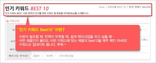 3. 파우더룸 best 10 확장 한 주간 이슈가 된 화장품 순위를 매기는 ‘파우더룸 best 10’의 카테고리가 확장되었다. 한 주간 종합적으로 인기가 많았던 화장품을 바탕으로 순위를 정한 ‘종합 best 10’, 최근 이슈가 되는 신제품을 발 빠르게 소개하는 ‘파우더룸 PICK’, 회원들의 투표가 반영된 ‘좋아요 best 10’, 화장품에서 기대할 수 있는 효과와 기능을 인기 키워드로 설정하여 인기도가 높은 제품으로 순위를 매기는 ‘인기 키워드 best 10’ 등으로 세분화되어 볼거리가 풍성해졌다.