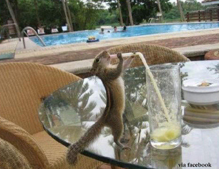 뒷발로 균형을 잡고, 앞발로는 빨대를 쥐고 얼굴을 뒤로 젖힌채 음료수를 먹고 있는 이 다람쥐의 모습은 동물이 아니라 사람의 몸짓과 유사하다.