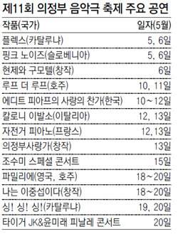 올해 6개국 7개 작품 초청공연의 주빈국은 스페인 카탈루냐다. 카탈루냐 지역 서커스와 춤을 결합한 ‘플렉스’가 개막작이다. 1920, 30년대 미국에서 유행한 빅밴드 재즈 콘서트 형식의 흥겨운 카탈루냐 음악극 ‘싱! 싱! 싱!’은 폐막작으로 마련됐다. 핑크빛 외계인 분장을 한 채 의정부 시내를 돌아다닐 ‘핑크 노이즈’, 전자음악에 맞춰 춤추는 대형 슬링키(스프링 장난감)들의 야외공연 ‘파밀리에’, 그리고 축제 명예위원장을 맡은 소프라노 조수미의 스페셜 콘서트도 빼놓을 수 없다.