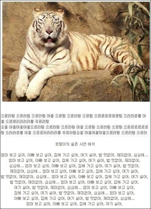 ‘호랑이의 슬픈 사연’글 작성자는 ‘어흥 으르렁 으르러렁 으르르르르르렁 으러러으흥 어흥’ 등으로 호랑이의 울음 소리를 표현한 뒤 그 울음이 “집에 가고 싶어, 배고파, 여기 싫어” 등으로 해석된다고 덧붙였다.