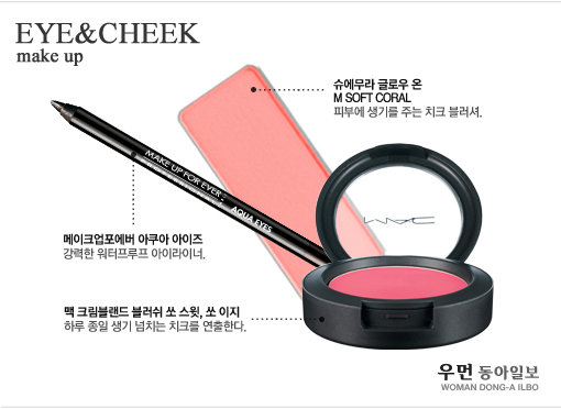 Pro’s Tip 동안 메이크업을 위해 중요한 것은 피부 표현과 블러셔. 깨끗한 피부 표현만으로도 10살 이상 어려보일 수 있고, 사랑스럽고 어린 이미지를 연출하기 위해서는 블러셔가 필수다. 특히 블러셔는 색상 선택과 위치에 따라 분위기가 달라질 수 있는데 중앙에 연출하면 귀여운 이미지를, 귀 쪽 사선 방향으로 올려 그려주면 여성스러운 이미지를 연출할 수 있다. 글·박해나<우먼 동아일보 http://thewoman.donga.com 에디터 phn0905@gmail.com> 이지은<우먼 동아일보 http://thewoman.donga.com 인턴 에디터 kylove07@naver.com> 도움주신 곳·메가폰 제니하우스 청담점 02-514-7243 맥 02-3440-2645 메이크업포에버 02-3438-5426 슈에무라 02-3497-9811