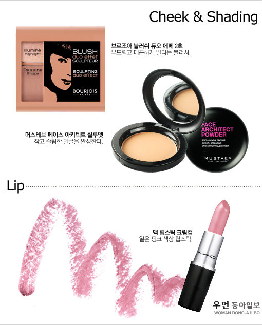 LIP 누드핑크 립스틱을 톡톡 두드리듯 발라 마무리한다. 글·이수영<우먼 동아일보 http://thewoman.donga.com 에디터 swim1020@hanmail.net> 이지은<우먼 동아일보 http://thewoman.donga.com 인턴 에디터 kylove07@naver.com> 도움주신 곳·인포마스터 앳폼조성아 02-517-5436 나스 02-511-1522 맥 02-3440-2645 바비브라운 02-3440-2665 크리니크 02-3440-2769