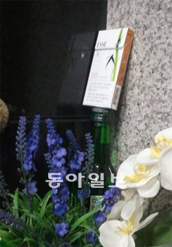 꽃 뒤에 놓인 소주 한 병과 담배 한 갑이 인상적이다. 파주=김창덕 기자 drake007@donga.com