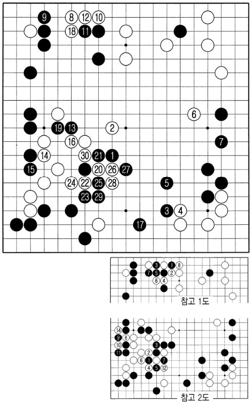 흑이 13으로 좌중앙 백의 공격에 나서자, 백은 20으로 건너 붙여 타개를 꾀한다. 이어 22로 젖혀 흑의 약점을 이용해 하변을 뚫으려 한다. 참고 2도 흑1로 두는 것이 일감. 흑7까지 패를 감수하고 막을 수는 있지만, 백이 8부터 좌변에서 팻감을 만든 뒤 패를 결행하면 흑이 견딜 수가 없다. 결국 23으로 물러서는 수를 택했지만, 30까지 백이 거의 안정됐고, 흑집도 많이 줄었다. 백 우세.