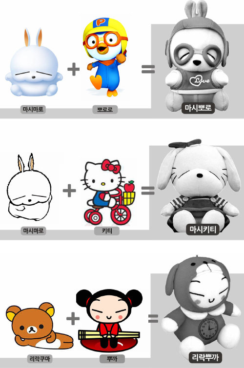 시중에 유통된 ‘마시뽀로’ 인형을 보면 마시마로의 축 처진 눈에 뽀로로 특유의 동그란 안경과 헬멧, 의상이 입혀져 있다. 인기 캐릭터의 특징만 모아 놓다 보니 아이들은 “종합선물세트 같다”며 호응한다. 세계 120개국에 수출된 토종 캐릭터 ‘뿌까’의 얼굴과 일본 인기캐릭터 리락쿠마(곰)의 몸을 합친 ‘리락뿌까’ 인형도 인기가 높다. 마시마로 얼굴에 헬로 키티(고양이) 특유의 수염과 핑크색 리본을 붙인 ‘마시키티’도 있다. 이 밖에 마시뿌까(마시마로+뿌까), 도라쿠마(도라에몬+리락쿠마)도 있다.