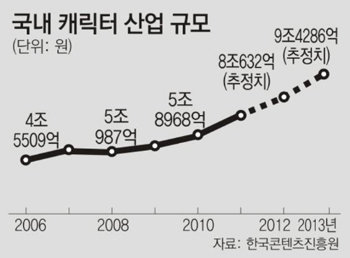 국내 캐릭터 업체들은 퓨전 캐릭터들의 ‘습격’에 큰 피해를 보고 있다. 한국콘텐츠진흥원에 따르면 국내 캐릭터 산업 규모는 2006년 4조5509억 원에서 2011년 7조591억 원으로 6년간 55.1% 증가했다. 2014년에는 11조 원을 넘을 것으로 추산된다.