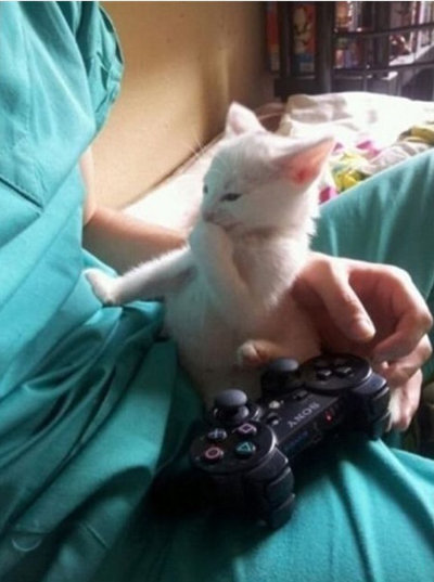 공개된 사진에는 새끼 고양이 한 마리가 주인의 배 위에 앉아 앞발로 주인을 짚고 한 쪽 발을 입에 대고 있는 모습이 담겨 있다.