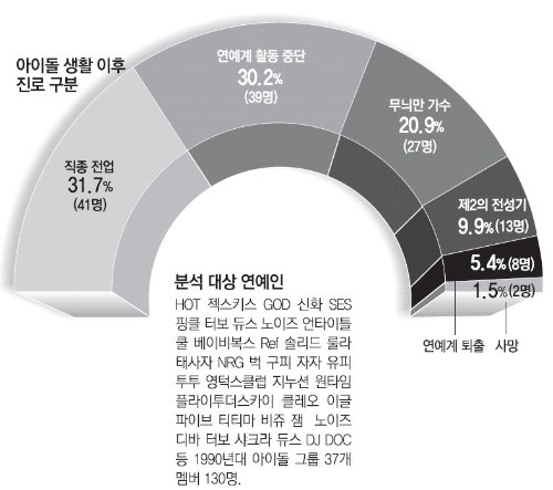 반면 화려했던 아이돌 시기가 지난 후 솔로로 데뷔하거나 재결성 앨범을 내도 별다른 반응을 얻지 못한 경우는 20.9%(27명)에 달했다. ‘이별공식’ 등으로 90년대 큰 인기를 얻은 Ref도 지난달 새 앨범을 냈지만 큰 호응을 얻지 못했다. ‘구피’ ‘NRG’ ‘영턱스클럽’ 등도 재결성 앨범을 냈지만 인기를 끌지 못했다. 조사대상 아이돌 그룹 멤버의 30.2%(39명)는 연예계 활동을 아예 중단했다.