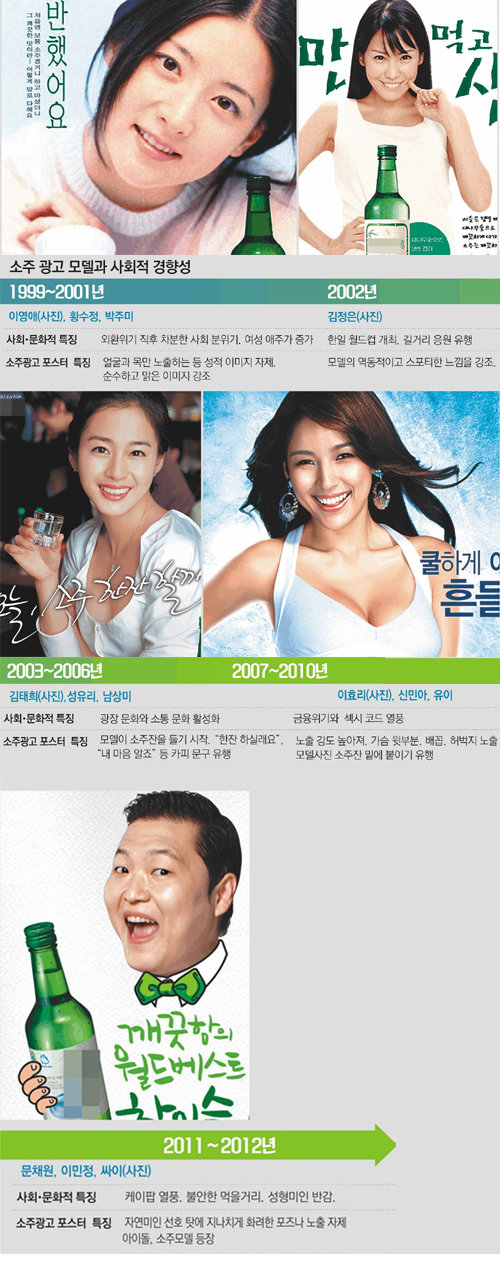 2012년 말에는 소주 광고에 한류 열풍이 불었어요. 케이팝(K-pop·한국대중가요)의 열풍을 업고 싸이를 비롯해 ‘카라’의 구하라, ‘포미닛’ 현아가 모델로 등장했습니다. 아이돌 소주 모델은 늘고 있어요. 아이돌 그룹은 미성년자가 포함된 경우가 많아 역효과가 난다는 거였죠. 관례를 깨고 아이돌을 발탁한 걸 보면 한류가 세긴 센 거 같아요.