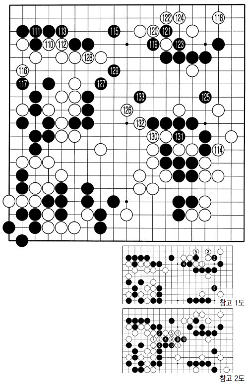 백으로서는 흑 대마를 잡을 수는 없었을까. 128 대신에 참고 2도처럼 백 1로 두어 공격하는 게 최선. 하지만 흑 2, 4로 나와 끊는 강수가 있다. 흑 8로 건너 붙여 흑 12까지 되면 백이 수상전에서 불리한 그림이다.