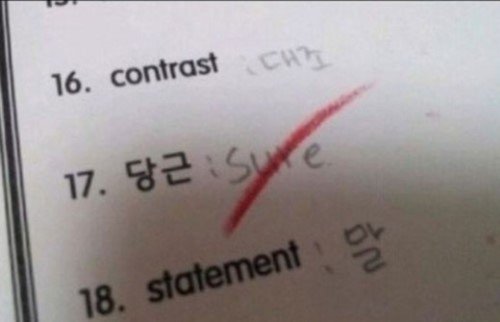 공개된 이미지는 영어 단어 시험지다. 이 학생은 한글 단어를 영어로 바꾸는 문제에서 당근을 ‘CARROT’이 아닌 ‘SURE’로 적어 놓았다. 이는 채소를 뜻하는 의미가 아닌 당연하지(당근이지)로 해석했기 때문이다.