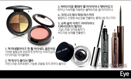 아이라인은 또렷함을 연출하기 위해 리퀴드 타입과 젤 타입을 모두 사용했다. 먼저 브라운 컬러의 리퀴드 라이너로 속눈썹 사이사이를 꼼꼼히 메운 후, 젤라이너로 점막 윗부분을 따라 얇은 라인을 그려준다.
