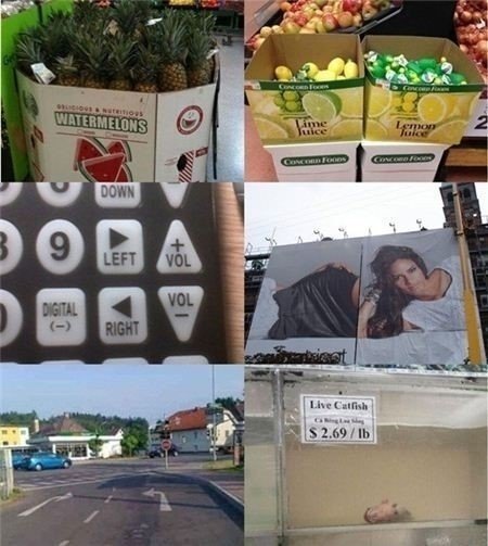 공개된 ‘뭔가 잘못된 사진들’에는 왼쪽, 오른쪽 버튼이 잘못 표시되어 있거나 모델의 상반신과 하반신이 잘못 배열되어 있는 광고판이 담겨 있다. 레몬과 라임 박스에 각각 라임과 레몬이 잘못 담겨져 있는 모습, 자동차 도로 바닥에 그려진 좌회전과 우회전 표시가 잘못된 모습도 눈길을 끈다.