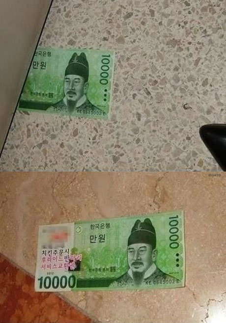 '무조건 당하는 전단지' 사진 속에는 만 원짜리 지폐로 보이는 종이가 담겨있다. 그러나 이 종이를 가까이서 보면 전단지임을 알 수 있다. 멀리서 보면 현금으로 착각하게 만들어 놔 주워서 볼 수밖에 없도록 한 것.