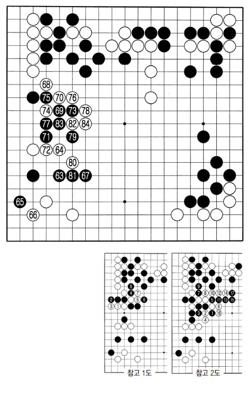 결국 흑은 77로 백 1점을 잡을 수밖에 없고 백은 78로 두 점 머리를 힘차게 젖힌다. 돌을 놓는 손에 힘이 실린다.