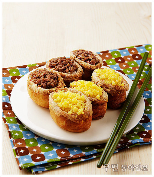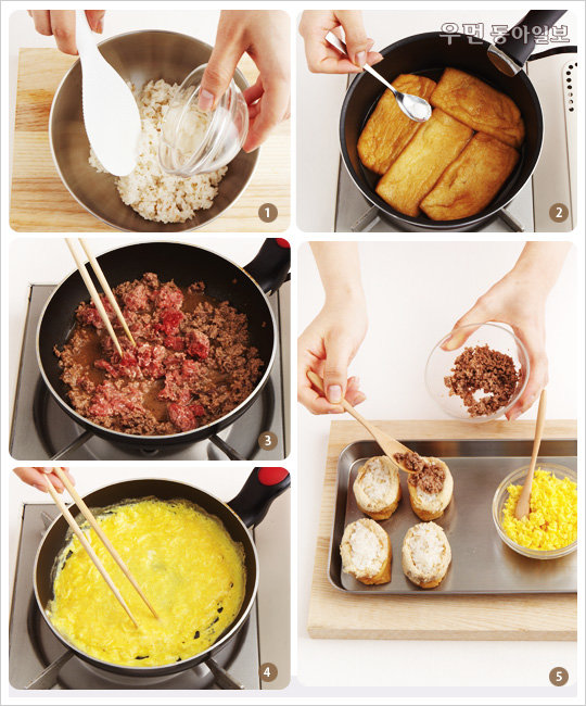 요리하기 1. 뜨거운 밥에 밥 양념재료를 넣어 잘 섞어준다. 2. 냄비에 유부와 유부조림 양념 재료를 넣고 중약불에서 10분 정도 조린 뒤 유부에 반으로 칼집을 내어 준다. 3. 쇠고기에 물1/4컵과 데리야키 소스, 후춧가루 약간을 넣고 섞은 뒤 달군 팬에 올려 젓가락으로 섞어준다. 4. 달걀을 잘 풀어 소금 약간과 맛술 1.5스푼을 섞어 체에 내린 뒤 팬에서 스크램블처럼 섞어가며 볶는다. 5. 칼집을 넣은 유부 안에 밥을 넣고 볶은 쇠고기 소보로와 달걀 소보로를 각각 얹어 마무리. 단촐한 집을 위한 간단하고 트렌디한 레시피 ‘小식구 밥상’은···
