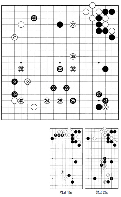 근거를 마련하기 위해 둔 22는 부분적인 정수. 하지만 참고 1도처럼 백 1로 두는 것이 발이 빨라 더 좋았다. 흑 4로 압박해도 백 5부터 백 9까지 받아 견딜 만한 모양이다.