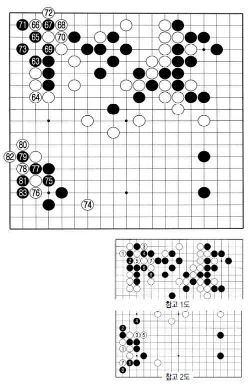 73까지 일단 흑이 잘 살아간 모습이다. 실리로는 백이 약간 불리한 형세. 백은 두터움을 이용해야 하는 상황이다.
