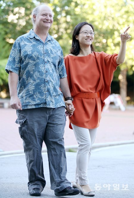 티머시 레빈(왼쪽), 박희선 고려대 미디어학부 교수 부부가 3일 서울 안암동 고려대 교정을 거닐고 있다. 두 사람은 “결혼 초기에는 서로 다른 습관을 맞추느라 조금 싸웠지만 둘 다 커뮤니케이션 학자라 작은 오해가 생기면 꽤 잘 풀기 때문에 이젠 싸울 일이 거의 없다”고 말했다.