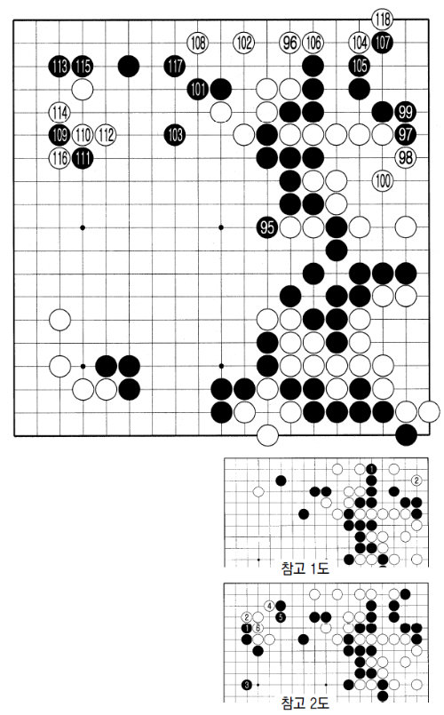 홍성지 9단은 우변 백 대마를 놓쳤지만 95로 중앙 백 2점을 잡아 둔다. 선수를 잡은 백은 96으로 둬 우상귀 흑을 압박한다.
