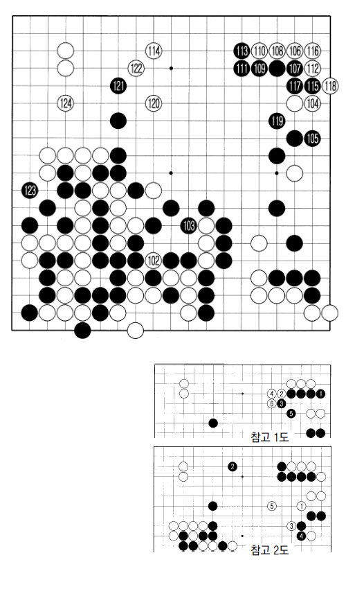 114는 큰 곳. 하지만 이세돌 9단은 대국 후 복기 과정에서 이 수를 패착으로 지목했다. 참고 2도처럼 백 1로 두어 중앙으로 진출하는 게 더 좋았다는 것. 흑 2가 큰 곳이지만 백 5까지 중앙으로 진출해 흑을 삭감하면 아직 어려운 형세라는 게 이세돌의 판단이다. 특히 흑이 하변 백을 패로 잡으러 갈 때 우변이 막혀 있는 것과 이렇게 터져 나온 것과는 차이가 크다는 얘기다.