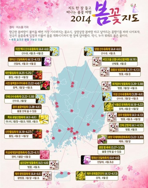 2014 봄꽃 지도를 본 누리꾼들은 “2014 봄 축제 일정, 벌써 봄이구나” “2014 봄꽃 지도, 생각만 해도 좋네” “2014 봄꽃 지도, 빨리 여행가고 싶네” 등 다양한 반응을 보였다.