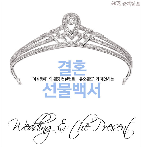 1주얼리 티파니 ‘세팅 링’ 결혼 예물의 하이라이트인 웨딩 링만큼은 다이아몬드의 순수한 광채를 최대한 살릴 수 있는 디자인을 선택, 영원한 사랑의 언약을 상징적으로 간직해야 하지 않을까. 웨딩 링의 대명사 티파니의 대표적인 다이아몬드 링인 세팅 링은 세계 최초로 밴드와 다이아몬드를 분리시킨 디자인으로, 다이아몬드를 지지하는 6개의 프롱(육지 세팅)이 밴드 위로 다이아몬드를 완전히 들어 올려 광채를 최대한 살려준다. 가격미정. 부쉐론 ‘쎄뻥 보헴 컬렉션’ 쎄뻥 보헴 컬렉션의 신작, 쎄뻥 보헴 이어링은 골드 볼로 둘러싸인 2개의 다이아몬드 티어 드롭 형태로, 신부의 우아한 업스타일 헤어와 어우러져 더욱 엘리건트한 분위기를 연출한다. 세트로 착용할 수 있는 펜던트는 네크리스 또는 브로치로 활용 가능한 멀티 아이템. 이어링 4천만원대, 네크리스 3천만원대, 펜던트 7백만원대. 쇼메 ‘조세핀 티아라’ 특별한 날의 주인공을 위해 탄생한, 세상에서 단 하나뿐인 티아라. 쇼메 아틀리에의 장인들이 전 세계에서 단 1피스만을 제작해 그 가치가 더욱 빛난다. 총 1백93개의 브릴리언트 컷 다이아몬드 8.34캐럿이 세팅되어 있다. 전국 쇼메 부티크에 사전 예약 방문하면 실제 착용해볼 기회도 얻을 수 있다. 가격미정.